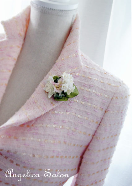 明るいスーツに、小さなお花を添えるだけで、喜びの気持ちがあふれ出すような印象のコサージュ